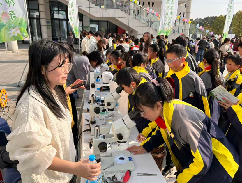 互动体验环节尤为突出科学探究特色。“花卉作物与昆虫知识”问答巩固了同学们的课本知识;显微观察昆虫结构、使用移液枪进行微量液体操作等实践,则让同学们亲身体验了科研仪器的使用。在显微观察区,孩子们排队通过体视显微镜观察不同昆虫的表面特征。一位参与活动的小学生兴奋地表示:“今天我见识了好多昆虫,以前都没有途径能了解这些东西,发现昆虫其实也蛮可爱的,还知道了不少昆虫小知识。”微量液体量取和高精度称量实验让孩子们在操控微量液体的过程中,理解了氧化还原反应、络合反应等基础化学原理,培养了精准操作与科学观察能力。这种寓教于乐的方式有效激发了青少年对科学研究的兴趣。