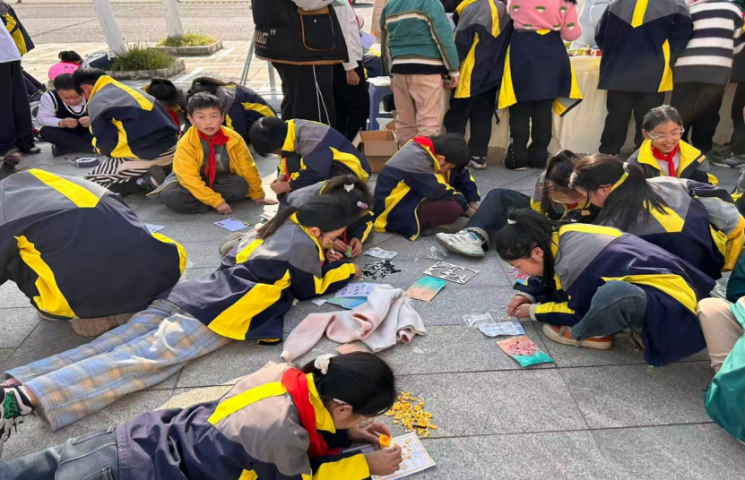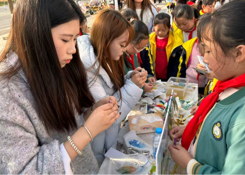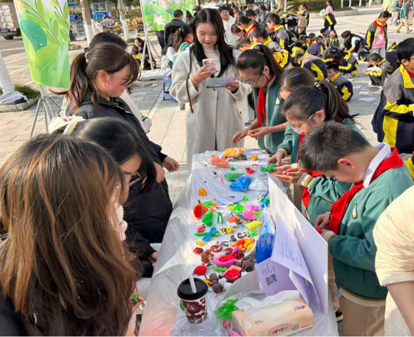 活动现场分为手工创作区、传统与创意展示区、互动体验区和抽奖区四大区域,各区域同步开放,参与者可自由选择体验。手工创作区内,昆虫扭扭棒、昆虫画、蝴蝶标本大赛、昆虫轻黏土制作等十余个摊位前排满了积极参与的同学。大家充分发挥创意,将昆虫元素与艺术创作相结合。“昆虫扭扭棒和轻黏土制作特别受欢迎,小朋友们通过动手制作立体昆虫造型,不仅了解了昆虫结构,也激发了创作灵感。”活动现场负责人介绍道。传统展示区则通过昆虫生态工艺品讲解和非遗糖画表演,生动展现了昆虫在文化与生态维度上的价值。尤其是昆虫主题的糖画表演,将传统技艺与自然教育相结合,吸引了大量同学驻足欣赏与互动。